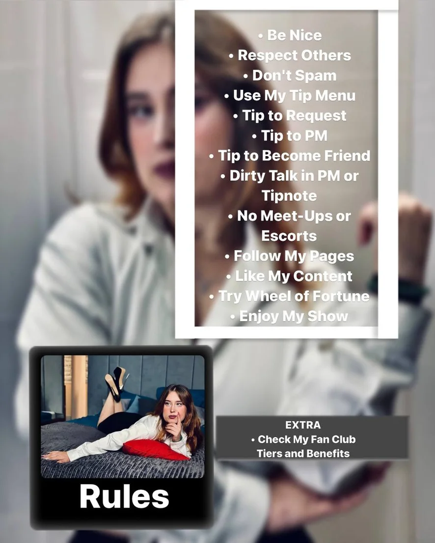 Flashing, Kneblowanie, W biurze, Striptiz, Twerking, Pokaz w oliwie, Klapsy, Taniec erotyczny, Szpilki, Fetysz stóp, Topless, Sprośne słówka, Ahegao, Camel toe, Instrukcja walenia konia, Skóra, Odgrywanie ról, Siadanie na twarzy, Na pieska, Poniżenie, Ocena kutasa, Zaglądanie pod spódniczkę, Masturbacja, Joga